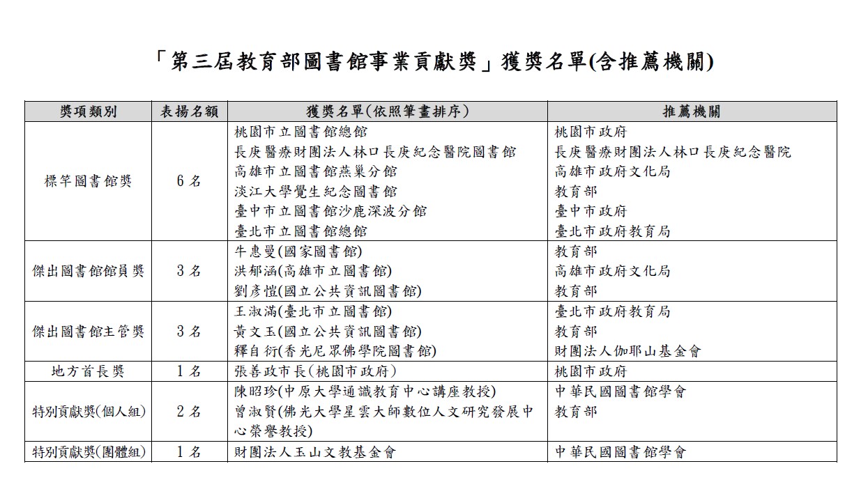 【所辦公告】恭賀劉彥愷校友榮獲「第三屆教育部圖書館事業貢獻獎」傑出圖書館館員獎